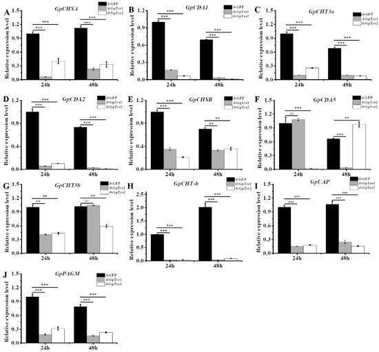 The expression levels of chitin metabolism pathway-related key genes belonging to the integument pathway and midgut pathway [27] were detected after knockdown of GpTre1 and GpTre2 by RT-qPCR. The results showed that the expressions of integument pathway-related genes, including GpCHSA, GpCDA1, GpCDA2, and GpCHT3a, were significantly downregulated 24 h and 48 h after knockdown of GpTre1 and GpTre2, respectively (Figure 6A–D). Genes involved in the midgut pathway, including GpCHSB, GpCHT3b, and GpCHT-h, were also significantly downregulated 24 h and 48 h after injection with dsGpTre1 and dsGpTre2, respectively, while GpCDA5 was downregulated after injection with dsGpTre2 at 24 h and after injection with dsGpTre1 at 48 h, and upregulated after injection with dsGpTre2 at 48 h (Figure 6E–H). Moreover, the expressions of two downstream key enzyme genes related to chitin metabolism, GpUAP and GpPAGM, were also detected. The results revealed that both GpUAP and GpPAGM decreased significantly 24 h and 48 h after injection with dsGpTre1 and dsGpTre2, respectively (Figure 6I,J).