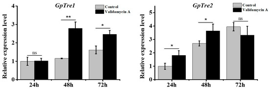 Changes in the expression levels of GpTre1 and GpTre2 at different times after injection with Validamycin A. The control group was treated with ddH2O. Data are shown as the mean ± SE of three biological replicates. Differences between Validamycin A and control group within each time point were compared using t-test. Asterisks above the bars indicate significant differences (* p < 0.05; ** p < 0.01; ns, no significance difference).
