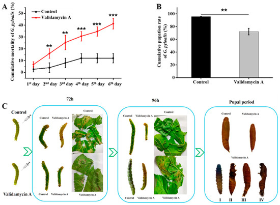 Analysis of the mortality and phenotypes after Validamycin A treatment. (A) Cumulative mortality, (B) cumulative pupation rate and (C) phenotypes of G. pyloalis after treatment with Validamycin A. The differences among three biological repeats were analyzed using R version 4.0.0 with one-way analysis of variance. All treatment group was compared with the control group at each time point. Asterisks above the bars indicated significant differences (** p < 0.01; *** p < 0.001).