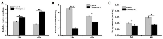 Detection of carbohydrate contents 24 h and 48 h after Validamycin A treatment. (A) Trehalose, (B) glucose, and (C) glycogen. Data are shown as the mean ± SE of three biological replicates. Differences between Validamycin A and control group within each time point were compared using non-parametric Mann–Whitney test. Asterisks above the bars indicated significant differences (* p < 0.05; ** p < 0.01; *** p < 0.001; ns, no significance difference).