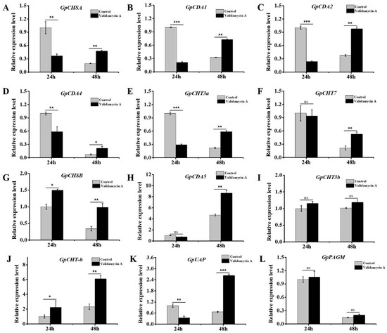 To further validate the roles of GpTre1 and GpTre2 on chitin metabolism, the relative expression levels of chitin metabolism-related genes were detected by RT-qPCR. A total of 12 genes were selected and evaluated, including 6 genes (GpCHSA, GpCDA1, GpCDA2, GpCDA4, GpCHT3a, and GpCHT7) involved in the integument pathway, 4 genes (GpCHSB, GpCDA5, GpCHT3b, and GpCHT-h) involved in the midgut pathway and 2 key enzyme genes (GpUAP and GpPAGM) involved in chitin metabolism. The relative expression levels of GpCHSA, GpCDA1, GpCDA2, GpCDA4, GpCHT3a, and GpCHT7 all decreased significantly at 24 h and increased significantly at 48 h after injection with Validamycin A (Figure 10A–F). GpCHSB and GpCHT-h increased 24 h and 48 h after injection (Figure 10G,J). GpCDA5 increased 48 h after injection (Figure 10H), but GpCHT3b showed no obvious change after injection (Figure 10I). GpUAP showed downregulation at 24 h and upregulation at 48 h after treatment, but there was no significant change to GpPAGM (Figure 10K,L).