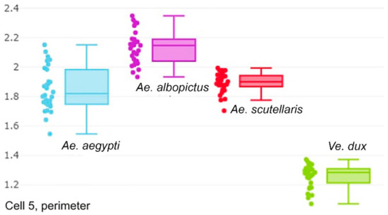 Quantile boxes showing the perimeter of the fifth cell (mm) derived from outline-based geometric morphometrics analysis. Each box shows the group median that separates the 25th and 75th quantiles. From left to right: Ae. aegypti; Ae. albopictus; Ae. scutellaris and Ve. dux. The other contours (not shown) showed almost exactly the same interspecific variation: the non-overlapping smaller size of Ve. dux versus the other species, and the trend for larger sizes in Ae. albopictus.