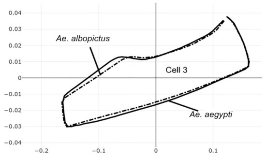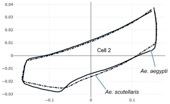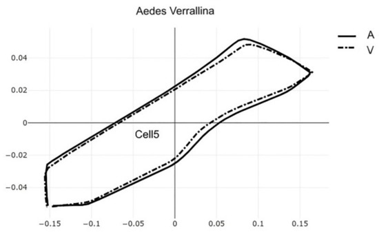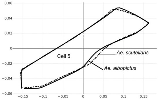 The pairwise comparisons included the one between the two genera Aedes (Stegomyia) and Verralina (Verrallina), with sample sizes of 90 and 30, respectively (Table 5, second column). All remaining pairwise comparisons were performed with equal sample sizes (30). For the pairwise comparisons, the superposition of the most-discriminating cells only was shown to visualize the shape changes from one species to another (Figure 3, Figure 4, Figure 5, Figure 6, Figure 7, Figure 8, and Figure 9).