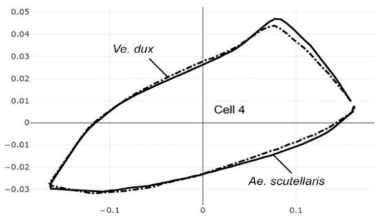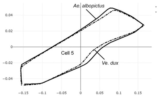 Superposition of size-free contours of cell 5 (see Figure 1) showing shape differences between two species, as well as two genera: Ae. albopictus (solid line) and Ve. dux (dashed traits).