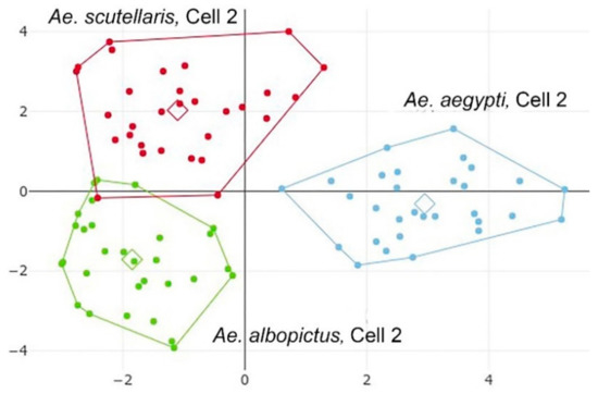 The same pattern of performance observed for the four-species comparison was confirmed: low scores were observed for cell 6 (36%) and cell 1 (59%), and acceptable (from 72% to 83%) or even very good (88%, from cell 2) scores were observed for the remaining cells (Table 4). The factor map (Figure 10) obtained from cell 2, which was the most informative cell when considering these three taxa, showed a clear tendency of species separation. Aedes albopictus and Ae. scutellaris were clustered together on one side of the first discriminant factor, and Ae. aegypti lay on the other side. This configuration conformed to the previously published phylogenetic tree from Sumruayphol et al., 2016 [6].