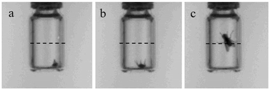 Illustration of the traits used to describe thermal tolerances of flies. The photos originate from an analysed video recording and show a housefly (M. domestica) progressively recovering from chill coma. Initially, the fly is still in coma (a). Hereafter, the fly starts moving its legs (termed “first movement”) (b) and finally crosses the middle of the vial by vertical movement (termed “first middle cross”) (c). Likewise, in the static high-temperature and dynamic assays, last middle cross and last movement were assessed. The traits were assessed in houseflies and black soldier flies (H. illucens) using both a manual and an automated phenotyping method.