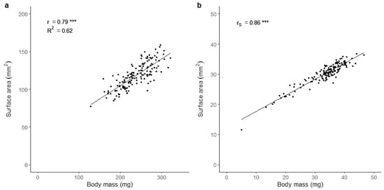 Correlations between body mass and surface area in larvae of the black soldier fly (H. illucens) (a) and the housefly (M. domestica) (b). Goodness of fit is indicated by the Pearson correlation coefficients r and R2 (a) and the Spearman correlation coefficient rs (b). Significance level is illustrated as *** (p < 0.001). n = 150 larvae for each species.