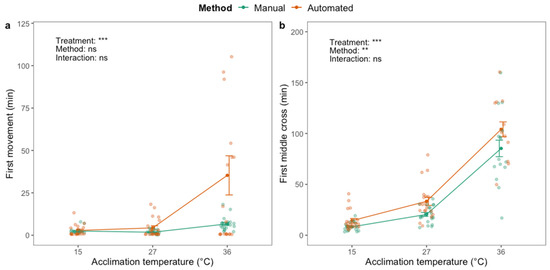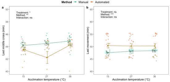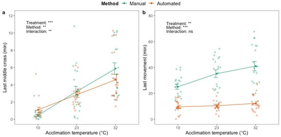 When assessing the CTmax, there was a significant effect of acclimation treatment on last middle cross (F2,116 = 3.56; p < 0.05) (Figure 4a) but not on last movement (Figure 4b). Heat-acclimated flies exhibited last middle cross at a higher temperature than flies from the other acclimation groups. There was a significant effect of the method on both last middle cross (F1,116 = 9.16; p < 0.01) and last movement (F1,119 = 16.34; p < 0.001), where last middle cross was observed at a lower temperature, and last movement at a higher temperature, with the automated phenotyping method compared to the manual method (Figure 4).