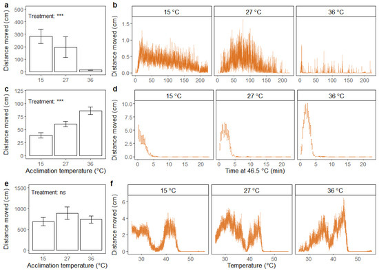 For black soldier flies, the effect of acclimation treatment on total distance moved after chill coma was significant (F2,59 = 26.72; p < 0.001), where heat-acclimated flies moved less (Figure 6a,b). In addition, the highest level of fly activity (peak in distance moved, Figure 6b) after chill coma seemingly occurred at an earlier time point for flies acclimated at low temperature compared to flies acclimated at an intermediate temperature. Flies acclimated at high temperature had stable low levels of movement.