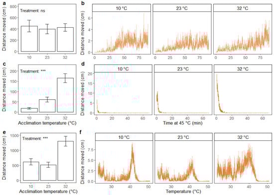 Distance moved (cm) summed across the duration of the assay (a,c,e) (mean ± standard error) and accumulated every 15 s (b,d,f) (mean ± standard error) for adult housefly males (M. domestica). Assays include recovery after 2 h of chill coma (0 °C) (a,b), exposure to static high temperature (45 °C) (c,d) and exposure to thermal ramping from 23 °C (0.2 °C min−1) (e,f). Prior to running the assays, flies were acclimated for 48 h at three different temperatures: 10, 23 and 32 °C. The results from one-way ANOVA on the effect of acclimation treatment on summed distance moved are included in the bar plots with significance levels illustrated as ns (not significant) and *** (p < 0.001). Data were log transformed prior to applying the ANOVA.