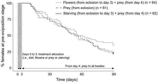 Kaplan–Meier curves showing the percentage of Harmonia axyridis females at pre-oviposition stage through time according to their diet (i.e., flowers, prey, or starving; diet offered over the first three days after eclosion, then all fed with Ephestia kuehniella eggs) plotted using the R package ‘‘survival’’ [43]. All the tested females were included in the analysis (including those that did not lay eggs at 90 days after emergence).