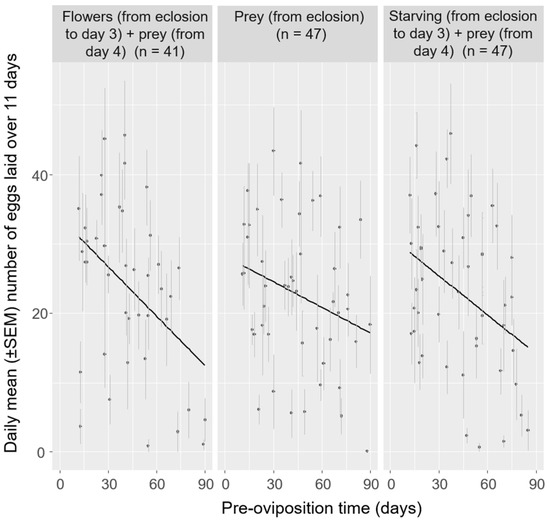 Linear regression of pre-oviposition time and the daily mean number of eggs laid per Harmonia axyridis female over 11 days for each diet (i.e., flowers, prey, and starving) plotted using the R package “ggplot2” [46]. See Table 3 for statistical results of the analysis.