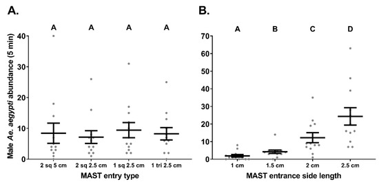 2.6. Experiment 4. MAST Head—Various Entrance Numbers, Sizes, and Shapes Semi-Field Cage Trial