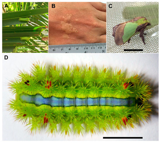 The stinging nettle caterpillar, Parasa lepida. (A) Caterpillars feeding on coconut leaves, (B) dermatitis symptom on a hand after exposure to caterpillar, (C) adult stage, and (D) final instar caterpillar with urticating hairs on its back (scale bar = 1 cm).
