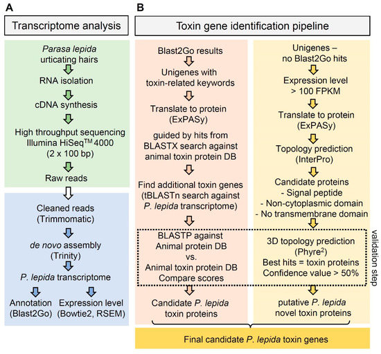 Flow chart of the P. lepida toxin gene identification pipeline: (A) transcriptome analysis—green box = RNA isolation and sequencing, blue box = transcriptome analysis; (B) toxin gene identification pipeline: identification based on orthologous relationships (left) and identification of novel toxin genes (right).