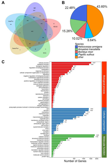 Overview of the BLAST2GO results: (A) intersection of different databases and numbers of contigs, (B) species distribution of best BLAST hits, and (C) genes classified by different categories (biological process, cellular component, and molecular function) and number of genes.