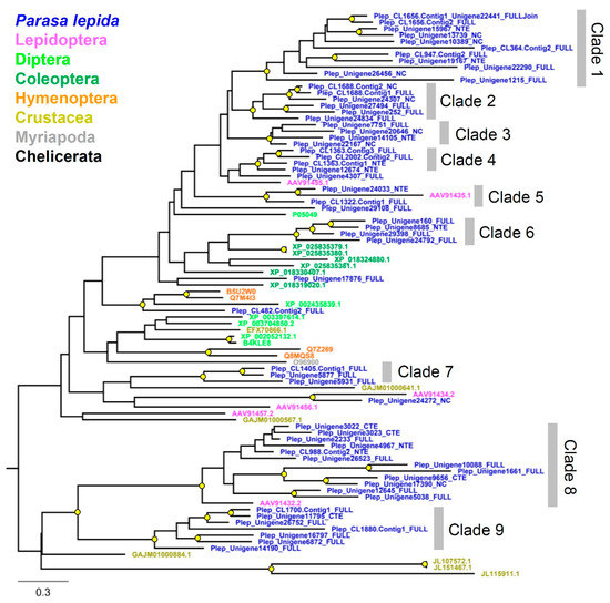 Phylogenetic relationships of P. lepida Peptidase S1 genes revealed multiple lineage-specific expansions (Figure 5), explaining this subfamily’s large size. Genes are divided into nine clades. The expansions were observed in clades 1, 8, and 9 (11, 12, and 7 genes, respectively). These genes’ closest relatives are serine proteases from L. oblique (AAV91435.1, AAV91432.2, and AAV91434.2).