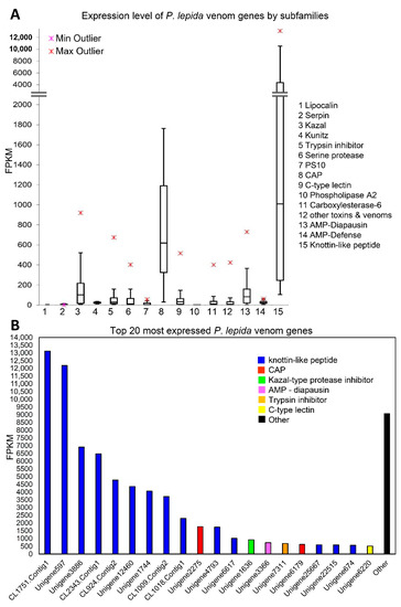 (A) Box-and-Whisker plot showing expression level (FPKM) of P. lepida venom genes by subfamily. Boxes show the upper quartile and lower quartile. The line across the box indicates the median. The maximum and minimum values (excluding outliers) are shown above and under the box, respectively. Upper and lower outliers are indicated using red and pink symbols, respectively. (B) The expression level of the top 20 most expressed P. lepida toxin genes.