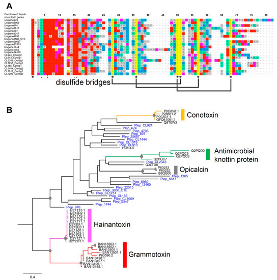 (A) Protein alignment of novel Knottin-domain protein from P. lepida showing six conserved cysteine residues and putative three disulfide bridges; (B) phylogenetic tree of Knottin-like proteins from P. lepida and other animals: Conotoxin—Conus achatinus (Little frog cone), Antimicrobial Knottin protein—Bemisia tabaci (Silverleaf whitefly), Opicalcin—Opistophthalmus carinatus (African yellow leg scorpion), Hainantoxin—Cyriopagopus hainanus (Chinese bird spider), Grammotoxin—Grammostola rosea (Chilean rose tarantula). Branch supports higher than 70% (1000 replications bootstrapping) are highlighted with grey circles.