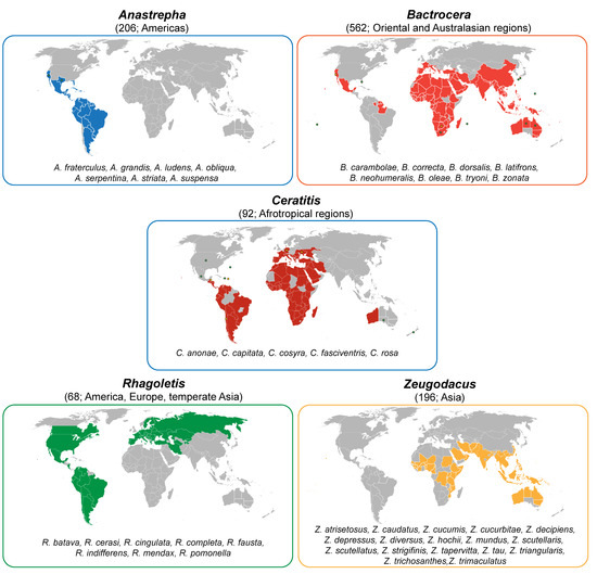 Worldwide distribution of species belonging to the Anastrepha, Bactrocera, Ceratitis, Rhagoletis and Zeugodacus genera. The map is based on the currently available distribution data of species belonging to each genus retrieved from the EPPO Global Database (https://gd.eppo.int) (accessed on 13 November 2020) and integrated with information from CABI (https://www.cabi.org/isc/) (accessed on 13 November 2020) and the literature. In brackets, the total number of living species (obtained from Catalogue of Life: 2019 Annual Checklist [40] and [39]) for each genus and the original geographic range are reported. Lists of the major pests within each genus are also indicated. Background map was retrieved from https://freevectormaps.com/world-maps/WRLD-EPS-01-0011?ref=atr (accessed on 29 July 2020). Information about the status of invasion is reported in more details for the species A. ludens, B. dorsalis and C. capitata, for which yellow and green dots indicate transient presence or achieved eradication, respectively.