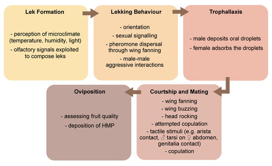 Semiochemicals are involved in the different phases of the reproductive behaviour of many tephritids, which include male lek formation and sexual signalling (sexual calling), courtship, acceptance of a mating partner and successful copulation (Figure 2).
