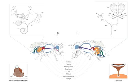 In general, the rectal valve of A. fraterculus and C. capitata is located at the distal portion of the colon, while the intestinal canal enlarges in a chamber comprising four rectal papillae projecting in the lumen of the rectal ampulla (i.e., the anterior rectum) [153]. In its proximal region, the ampulla is lined with epithelial cells that increase in number and are organized in folds in the distal portion. In several Anastrepha species, the structure of the female rectum is similar, with differences in the features of the epithelium [154]. In Bactrocera spp. (e.g., B. oleae, B. dorsalis and B. tryoni), the rectal glands of males and females display a remarkable sexual dimorphism [155,156,157]: muscles surrounding male glands are more abundant, suggesting a more complex contraction capacity to support the pheromone-storage and -release functions. The rectal sac (i.e., an evagination in the rectal gland) is present only in males. Because they are not surrounded by muscles and directly exposed to the haemolymph, the rectal pads, which extend into the gland as rectal papillae, have been suggested to be involved in transporting chemicals into the rectal gland [157].
