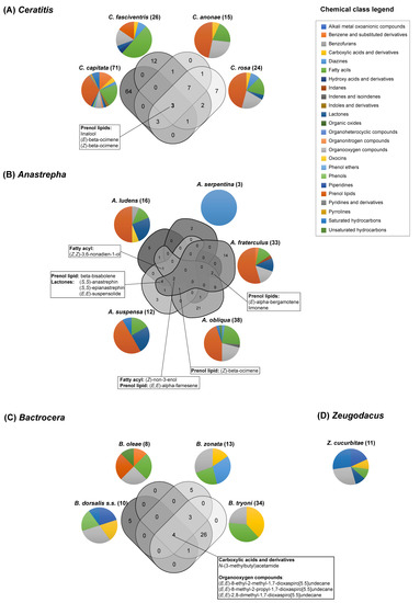 Overlap among chemicals identified in the headspace emissions of tephritids. Venn diagrams (http://bioinformatics.psb.ugent.be/webtools/Venn/) (accessed on 10 March 2021) illustrating the number of common and unique chemicals found among the compared species in the (A) Ceratitis, (B) Anastrepha, and (C) Bactrocera genera. (D) For the genus Zeugodacus, the number of compounds emitted by Z. cucurbitae are reported. Pie charts represent the proportion in chemical classes of the total number of compounds (in parenthesis) isolated for each species.