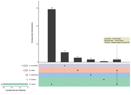 The species with a monophagous or oligophagous feeding strategy mostly emit chemicals that are not shared with other species with the only exception of nonanal, α-pinene and p-cymene, which are in common between B. oleae and R. cerasi. Figure 5 shows the number of chemicals identified in each species as well as the intersections of overlapping compounds, represented by connected dots (see Table S2 for the complete lists of unique and overlapping chemicals).
