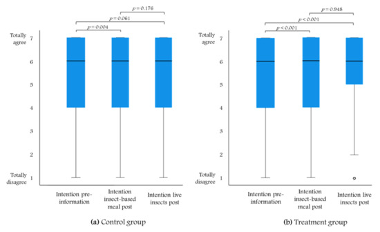Box plot representation and Wilcoxon signed-rank test results of intention to purchase a farmed duck fed with insects pre- and post-information treatment in (a) the control (n = 279) and (b) the treatment groups (n = 286).