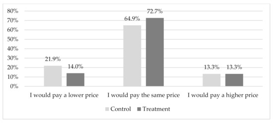 In contrast with the study of Ferrer Llagostera et al. [21], which found that consumers were willing to pay a premium for insect-fed fish, our results show that most of the respondents (64.9% in the control and 72.7% in the treatment group) would be willing to pay the same average price for both a duck fed with insect meal and a duck fed with vegetable meal. This might be explained by the low purchase familiarity among our respondents regarding the product under investigation (duck meat).