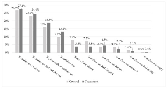 When asked how the idea of eating duck fed with an insect diet made them feel, most respondents reported curiosity and indifference, followed by a pleasant sense of surprise, with the informed group presenting higher percentages (27.4, 24.4, and 18.8%) than the control group (26.7, 23.2, and 16.0%), respectively, for curiosity, indifference, and pleasant sense of surprise. However, the only emotion that was significantly affected by the information was “disgust”. The frequency of “disgust” as a response decreased from 7.2% in the control group to 3.8% in the treatment group (p < 0.05). Figure 3 shows the frequency of emotional terms reported by treatment.