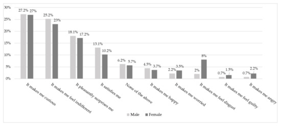 Figure 4 illustrates how the emotional term frequency changed based on gender. No significant gender differences emerged among most of the emotions, except for disgust. As shown in the table, females associated the idea of eating a duck fed an insect diet with disgust more often than males (8.0% compared to only 2.0% for females and males, respectively (p < 0.001)).
