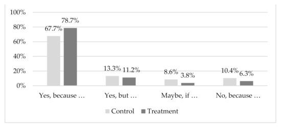 The rest of the sample indicated they would be willing to eat insect-fed duck only under certain conditions (“Yes, but…” and “Maybe, if…”). In this case, participants in the treatment group also reported that eating duck fed with insect-based meal was more reasonable than those in the control group. Among the main reasons for their responses, the respondents indicated that they would consume the meat “only if the insects are part of the life cycle of ducks” and if “the taste is not altered”, further noting that “the safety of insects should be reported”.