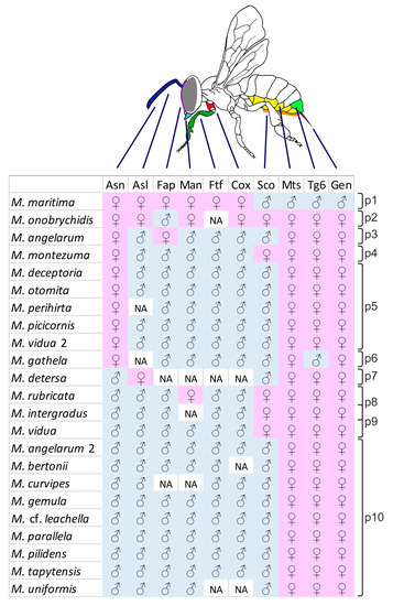 Number of antennal segments (Asn): In Anthophila, the number of flagellomeres is 10 in females and 11 in males. In some gynandromorphs (e.g., M. vidua and M. parallela [14]) the number of flagellomeres is 10 but the terminal one is incompletely divided on one side of the antenna. In these cases, which we interpreted as an incomplete fusion of two segments or an incomplete division of the last segment, we recorded the antenna as 11-jointed (male).