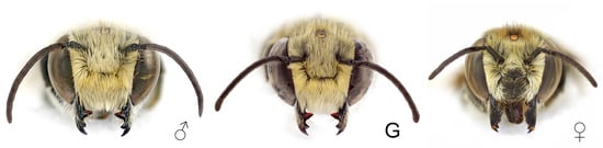 Head of Megachile pilidens, frontal view: ♂, male; G, gynandromorph; ♀, female.