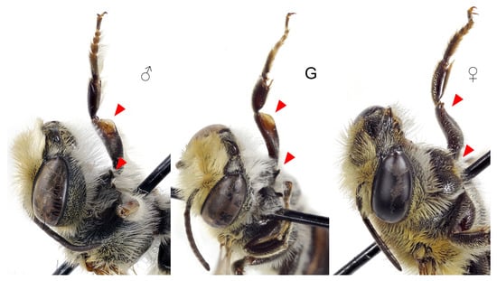 Front legs of Megachile pilidens: ♂, male; G, gynandromorph; ♀, female. Arrowheads indicate coxal spines and femoral dilatation.