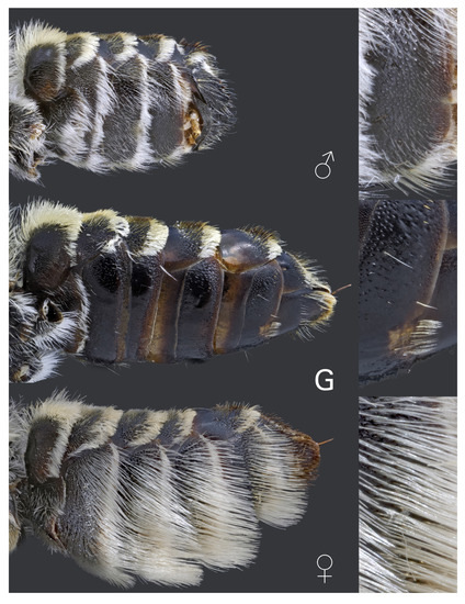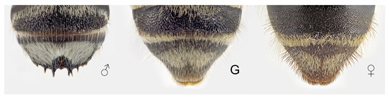 Metasoma of Megachile pilidens with detail of the penultimate sternite, ventro-lateral view: ♂, male; G, gynandromorph; ♀, female.