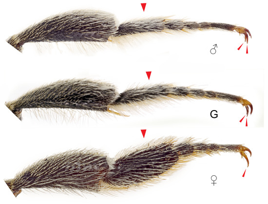 Hind legs of Megachile pilidens, lateral view: ♂, male; G, gynandromorph; ♀, female. Arrowheads indicates differences in morphology and setation of the first metatarsus and in the shape of the claws.