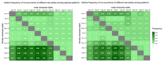 Relative frequency of pairwise combinations of male and female state for ten morphological characters. Left, species-pattern frequency distribution (sample size varies between 18 and 23, because some species patterns do not cover all the characters, see Figure 1). Right, pattern frequency distribution (sample size varies between 7 and 10, because some patterns do not cover all the characters, see Figure 1).