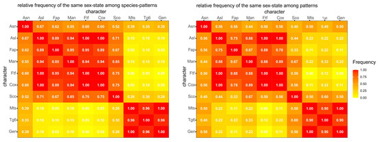 Relative frequency of pairwise sex-state concordance for ten morphological characters (the matrix is symmetric with respect to the main diagonal). Left, species-pattern frequency (sample size varies between 18 and 23, because some species patterns do not cover all the characters; see Figure 1). Right, pattern frequency (sample size varies between 7 and 10, because some patterns do not cover all the characters; see Figure 1).