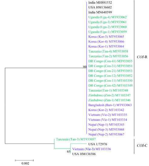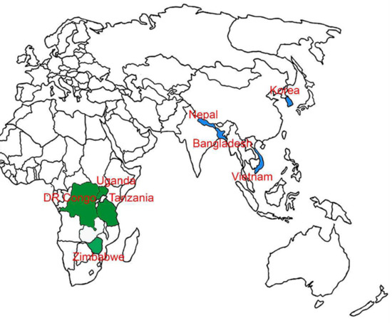 The FAW larvae were collected from corn fields (Zea mays L.) in Gyeongsan, Gyeongbuk Province, and adult moths were caught using the sex pheromone traps (GreenAgrotech, Gyeongsan, Korea) in Jeju Island of Korea from 2019 to 2020. Other specimens were obtained as larvae and adults from corn plants at various locations in Africa (DR Congo, Tanzania, Uganda, and Zimbabwe) and Asia (Bangladesh, Korea, Nepal, and Vietnam) from October 2017 to August 2020 (Figure 1; Table 1). In the field, FAW was identified based on the morphological characteristics of larva and adults. Specimens were stored 70% ethanol. Then, the vials were stored at −20 °C until further analysis.