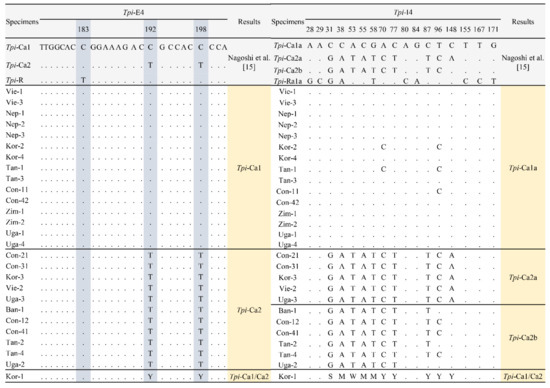 The SNP pattern of the Tpi gene was analyzed according to geographic distribution (Figure 2). The results showed that each subgroup was distributed in both Africa and Asia. For example, the Tpi-Ca1a subgroup was identified in DR Congo (Con-11, 42), Tanzania (Tan-1, 3), Uganda (Uga-1, 4), and Zimbabwe (Zim-1, 2) in Africa as well as in Nepal (Nep-1, 2, 3), Vietnam (Vie-1, 3), and Korea (Kor-2, 4) in Asia. Tpi-Ca2a was identified in DR Congo (Con-21, 31) and Uganda (Uga-3) in Africa, as well as Vietnam (Vie-2) and Korea (Kor-3) in Asia, whereas Tpi-Ca2b was identified from DR Congo (Con-12, 41), Tanzania (Tan-2, 4) and Uganda (Uga-2) in Africa, as well as Bangladesh (Ban-1) in Asia. The Tpi-Ca1/Tpi-Ca2 was identified only in Korea (Kor-1). The results showed that each subgroup was widely distributed in both continents in a mixed pattern.