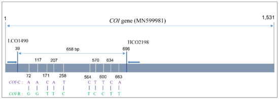 - Folmer, O.; Black, M.; Hoeh, W.; Lutz, R.; Vrijenhoek, R. DNA primers for amplification of mitochondrial cytochrome c oxidase subunit I from diverse metazoan invertebrates. Mol. Mar. Biol. Biotechnol. 1994, 3, 294–299. [Google Scholar] [CrossRef] [PubMed]