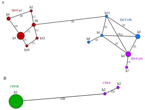 The evolutionary relationship of both Tpi and COI gene haplotypes from FAW was assessed using the minimum spanning network. In the Tpi gene, 12 haplotypes were identified and separated into two distinct groups, Tpi-Ca1 and Tpi-Ca2, by nine mutational steps (Figure 5A). The Tpi-Ca1 consisted of six haplotypes. Among Tpi-Ca2, two haplotypes (h4 and h7) belong to the subgroup Tpi-Ca2a, whereas four haplotypes (h1, h3, h8, and h11) belong to the subgroup Tpi-Ca2b (Table 3). Some identical haplotypes were identified in both Africa and Asia. For example, the h5, which is the most frequent haplotype, was found in two African (Con-42 and Zim-1) and six Asian specimens (Kor-4, Nep-1, Nep-2, Nep-3, Vie-1, and Vie-3). The h6 haplotype was found in one African (Tan-1) and one Asian specimen (Kor-1). The h4 haplotype was found in three African (Con-21, Con-31, and Uga-3) and one Asian specimen (Vie-2).