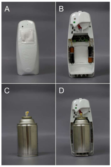 The spray devices used in the experiments. (A) The spray holder inside which the canister was fixed, (B) the spray holder with an electronic, controlled timer, (C) the canister, and (D) inside view of the spray device with the canister.