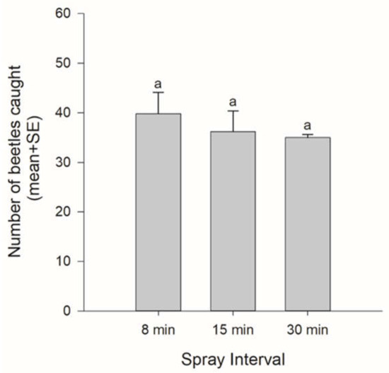 The numbers of beetles caught according to spray intervals (a proxy for the concentration of PA). Bars with the same letters were not significantly different (Tukey–Kramer HSD test, p > 0.05).