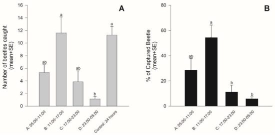 Mean (+SE) numbers of beetles captured in each time period and during the 24-h spray (A) and the proportion of beetles captured in each time period (B). Bars with the same letters were not significantly different (p > 0.05).