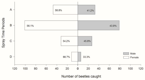 Beetles were caught throughout the day (Figure 3). However, there were differences among the time periods (χ2 = 26.63, df = 4, p < 0.001) (Figure 3A). The number of beetles caught in time period B (1100–1700) was almost the same as that caught during the 24-h spray. Over 90% were caught in time periods A, B, and C, and less than 10% were caught in time period D (23:00–05:00) (Figure 3B). A significantly greater percentage of beetles were caught in time period B than in time periods C and D (χ2 = 26.499, df = 3, p < 0.001). When analyzed separately, there were no differences in the numbers of male and female beetles caught in each time period (time period A (05:00–11:00): χ2 = 2.45, p = 0.117, time period B (11:00–17:00): χ2 = 2.70, p = 0.101, time period C (17:00–23:00): χ2 = 0.42, p = 0.515, and time period D (23:00–05:00): χ2 = 2.04, p = 0.153) (Figure 4).
