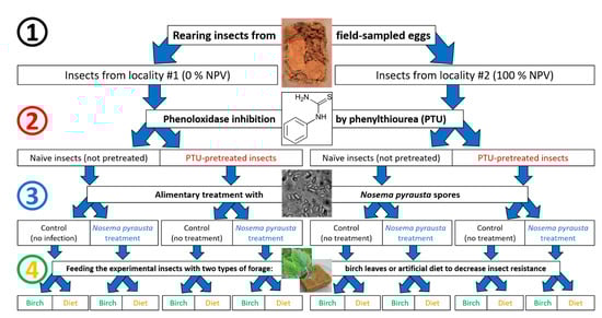 Briefly, the bioassay scheme was as following (see details below): (1) collection of II instar larvae reared from eggs collected from two localities; (2) 24 h pretreatment with PTU or water as control; (3) overnight starvation of larvae and alimentary treatment with microsporidia spores or water as control; and (4) separation of each experimental group into two subgroups, fed on birch leaves and on an artificial diet, respectively (Figure 1), with four replicates in each variant.