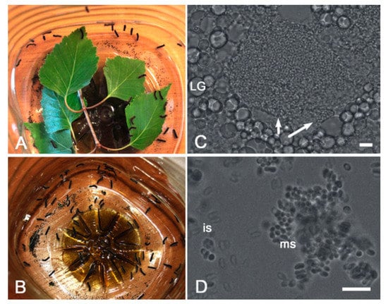 Infection of Lymantria dispar larvae with microsporidia. (A,B) A sample group of larvae before (A) and after (B) the contaminated birch leaves were consumed. (C,D) Bright field microscopy showing parasite spore-loaded infected cells (arrows) surrounded with lipid granules (LG) of uninfected cells, as well as immature (is) and mature spores (ms) on a smear. Scale bar = 10 micrometers.
